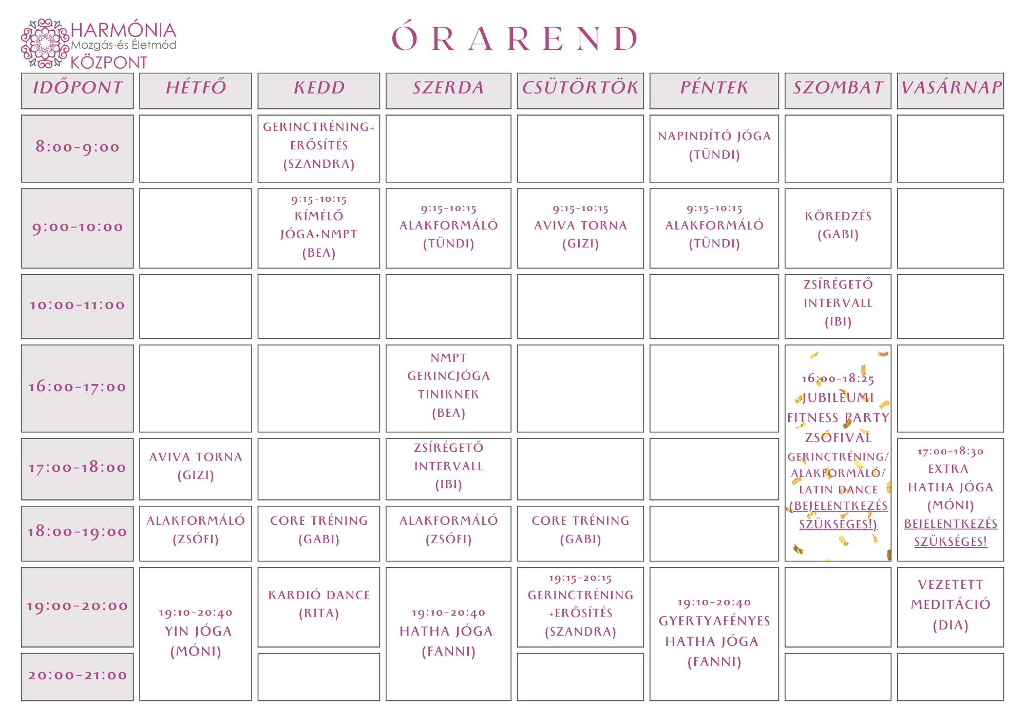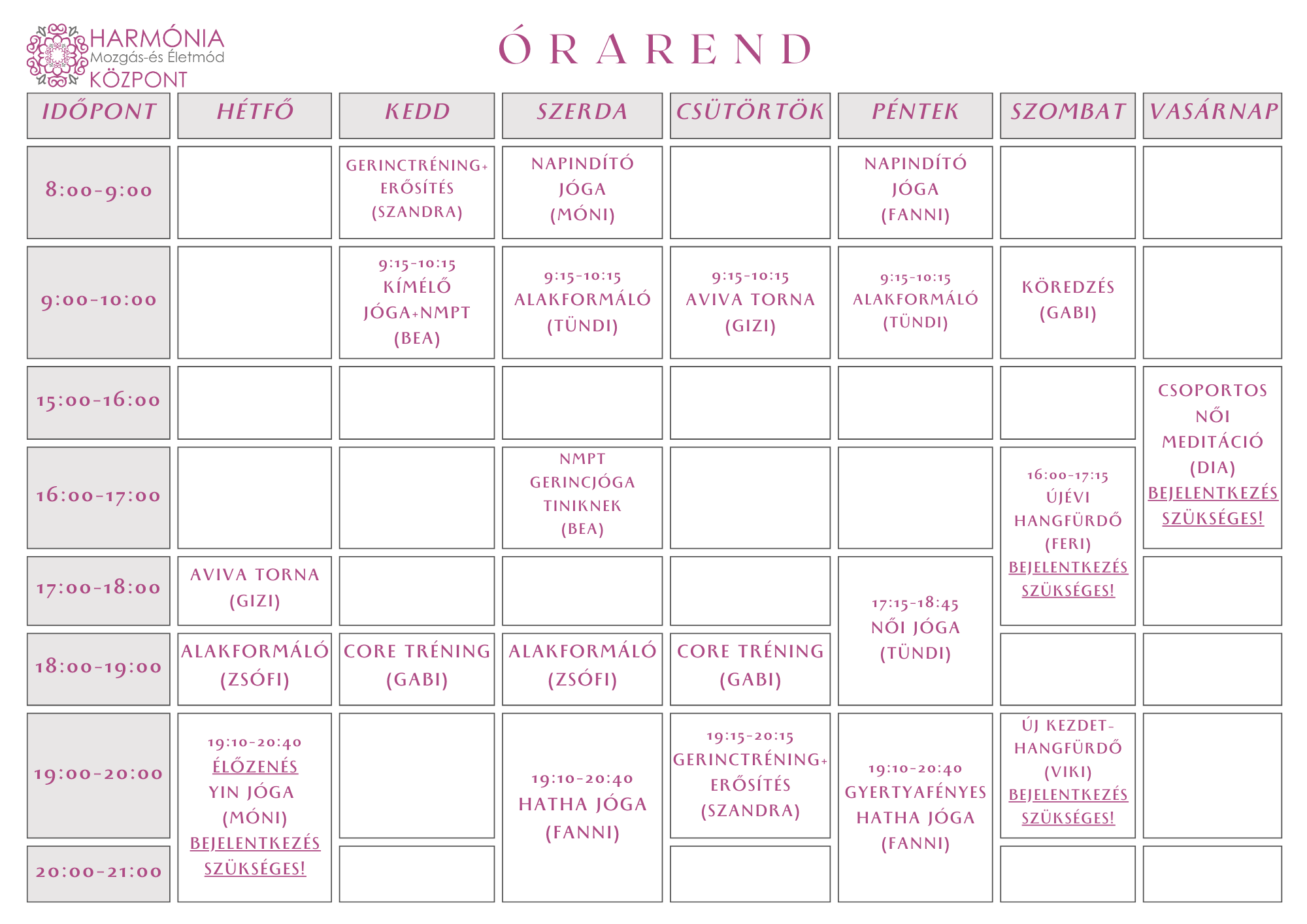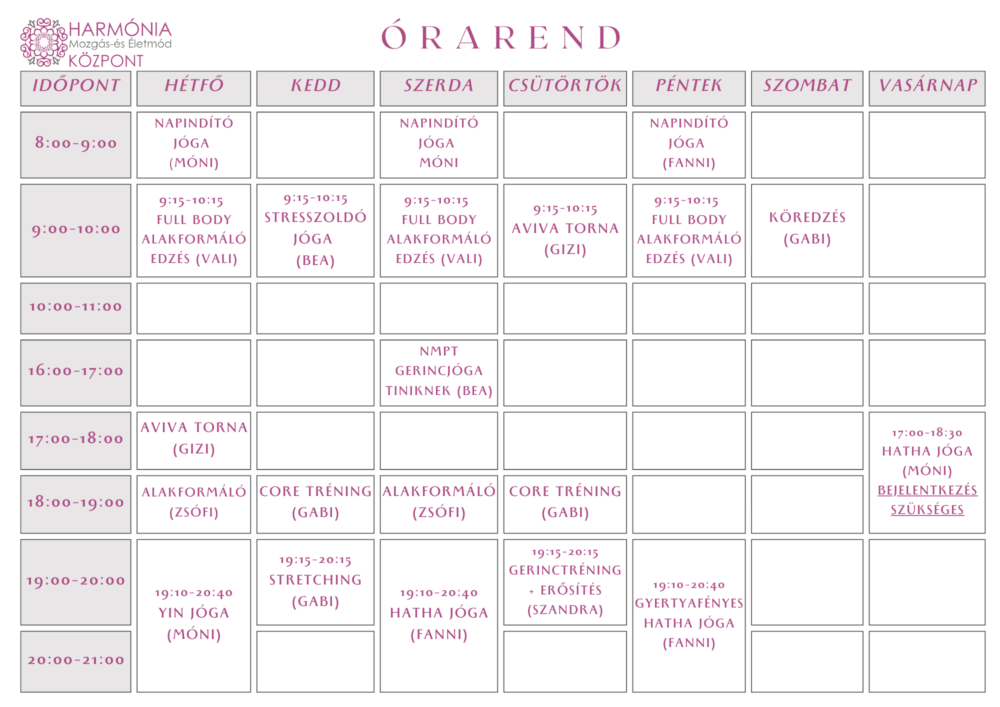 Csoportos óráinkra előzetes bejelentkezés nem szükséges. Kérünk, érkezz az óra megkezdése előtt 5-10 perccel. Köszönjük.